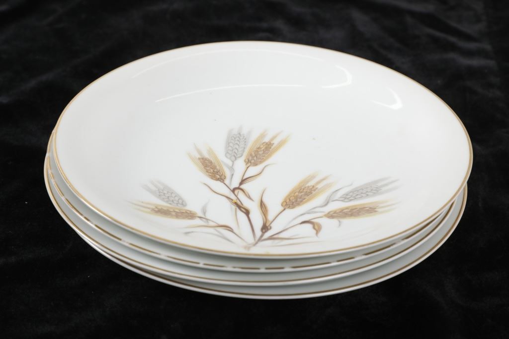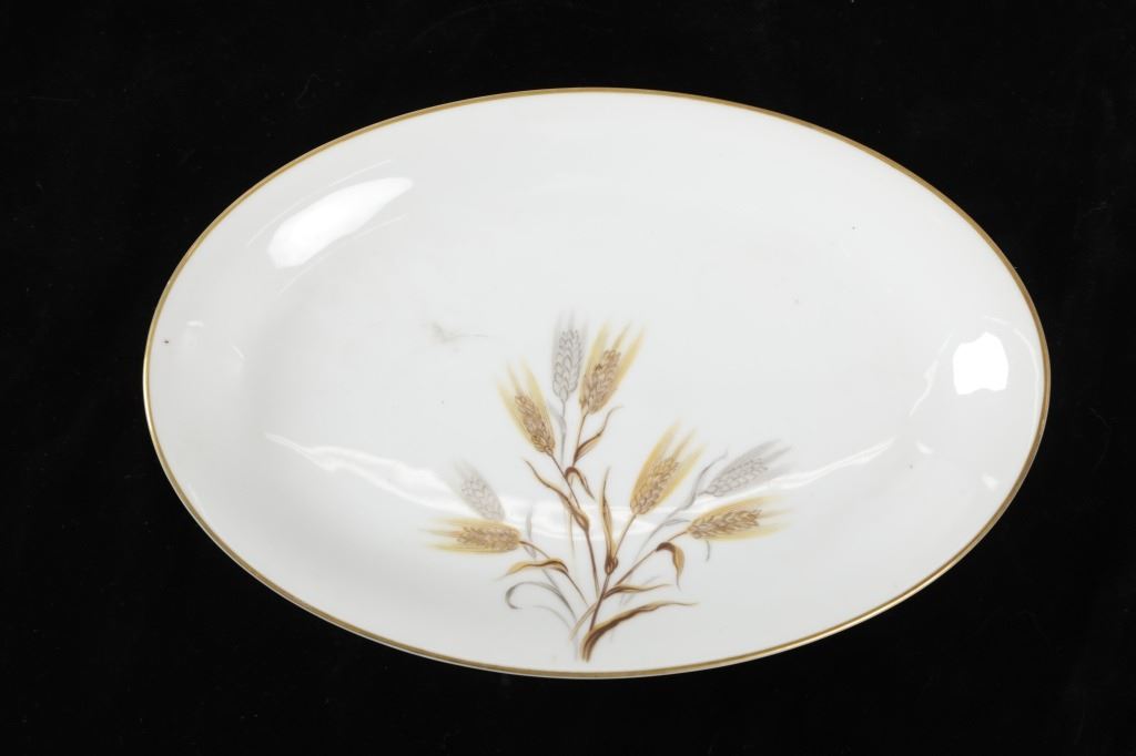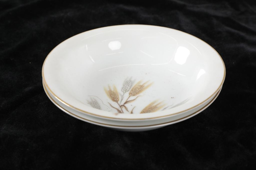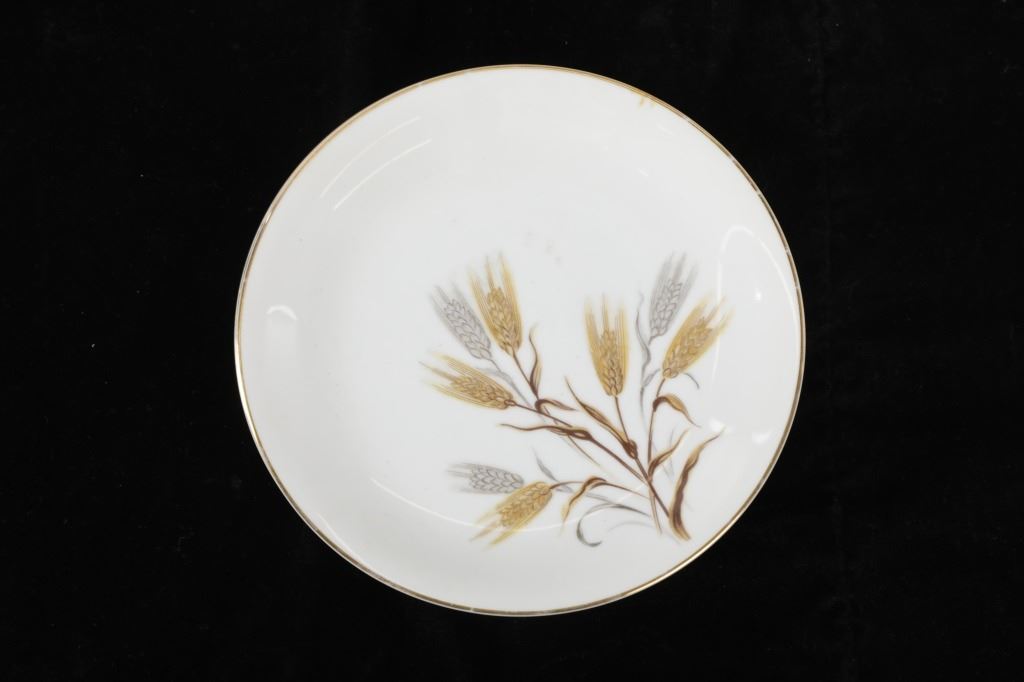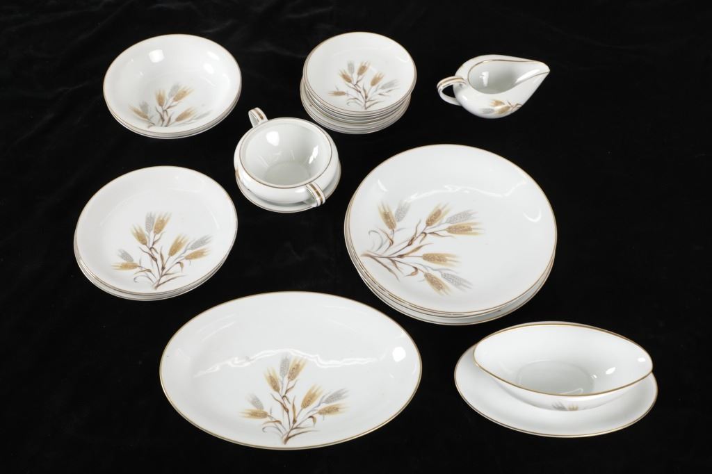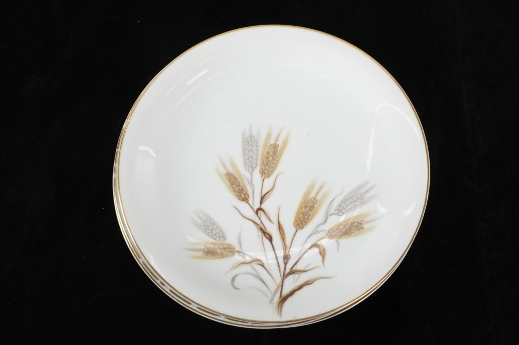 For your consideration is this set of Wheaton Fine China (5414) by Noritake produced between 1953 to 1967. Since 1904, Noritake has added beauty and quality to dining tables all throughout the world. The modern Noritake evolved from a commercial enterprise founded by the Morimura Brothers in New York in 1876. This trading enterprise imported chinaware, curios, paper lanterns, and other gifts. The Noritake Company was founded in 1904 in the village of Noritake, a small neighborhood of Nagoya, Japan. The primary purpose of this first facility was to produce western-style dinnerware for export. It took until 1914 to develop the first porcelain dinnerware plate fit for export. The oldest tableware plates were largely hand-painted, with a liberal use of gold. By the early 1920s, Noritake had invented assembly line techniques that enabled the mass production of high-quality, yet affordable dinnerware. Noritake is currently a recognized leader in tableware manufacture and marketing, with subsidiaries, factories, and affiliates around the world. The pieces show a white base color with accents of gold throughout. The pieces show strands of wheat in gray and golden yellow colors. The bottoms are marked reading, "Noritake China / Japan 5414 Wheaton". The collection includes a gravy bowl, a sugar cube cup, small saucer plates, a creamer pot, two large bowls, a small bowl, a large serving dish, three small plates and four large plates. They measure from 5 5/8" L x 5 5/8" W x 1 1/8" H to 8 1/4" L x 12" W x 1 1/4" H. They have a collective weight of 14 pounds and 8 ounces.*