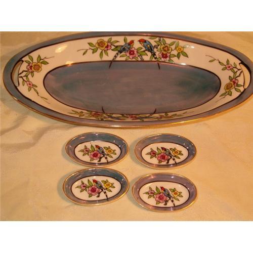 Set of a Noritake celery or vegetable bowl with blue luster,flowers and birds. There are 4 matching salt cellars. The salt cellars appear to be mint and never used but the bottom of the vegetable bowl has a few very minor scratches. I am being very picky because I believe in understating the items. This way you can be assured of being happy with your purchase