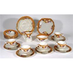 Noritake lustre part teaset, hand painted with fruit and an orange border, comprising cream jug, sugar bowl, fruit bowl, sandwich plate, five cups, saucers, six side plates and dessert bowls