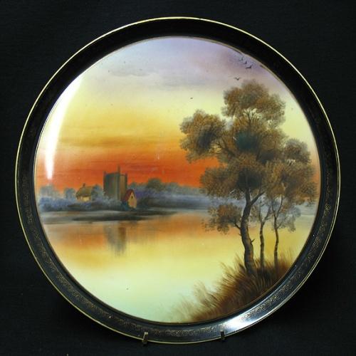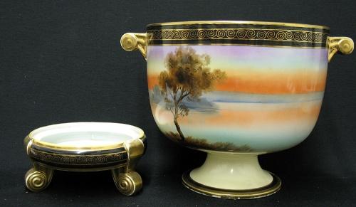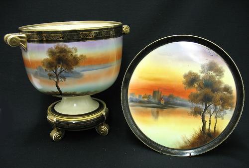 Noritake urn with stand and underplate; handled urn with banded border and hand painted scenic decoration; sits on stand with three scroll feet; underplate with scenic decoration; stand and underplate marked Noritake with green M; Hand Painted Made in Japan (no visible defects)