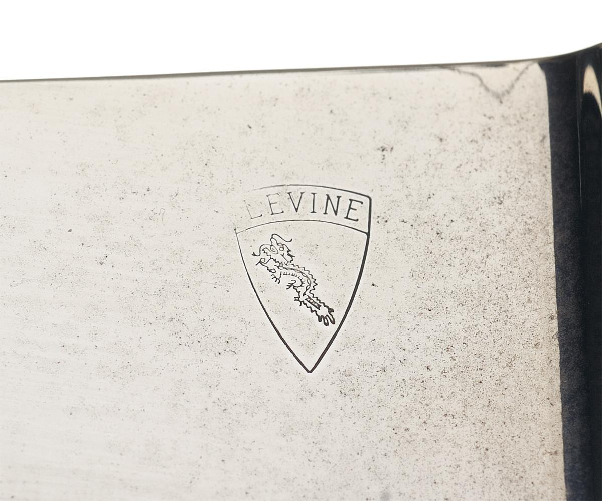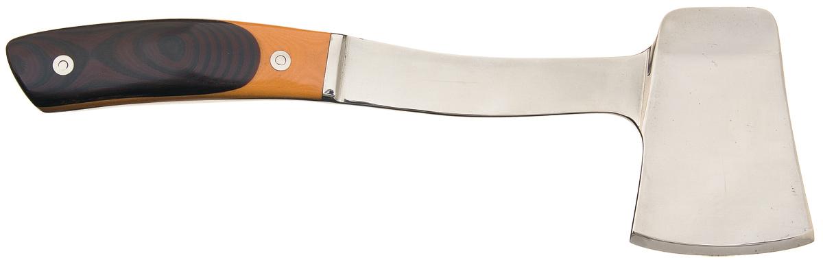 This hatchet was handcrafted by the late Norm Levine, a highly respected custom knifemaker and past voting member of the Knifemakers' Guild. The blade of this hatchet is 3 inches wide and 4 inches long. The Levine dragon logo is present on the steel shaft. Fitted with attractive contrasting micarta scales secured to the tang with two rivets. OAL: 12 1/8".