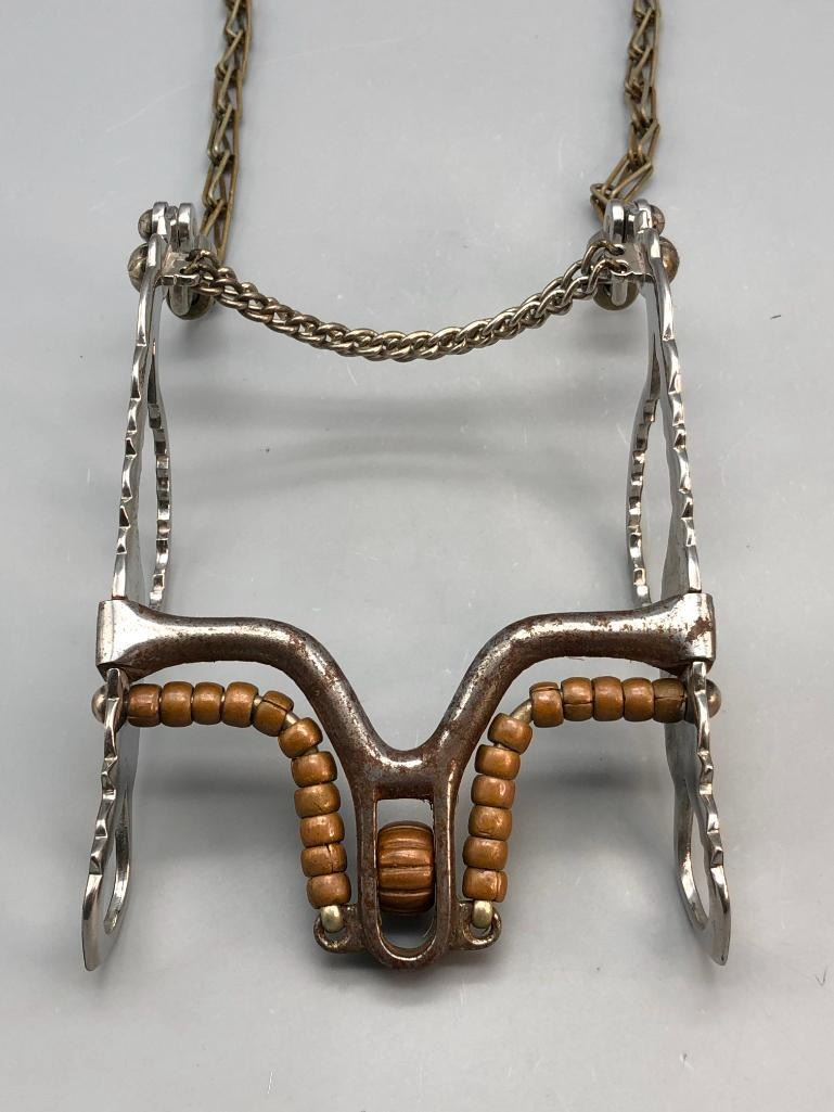 For your consideration is this Norm Vogt bit with rein chains. It has a high port with a copper roller and additional copper rollers on the mouth piece with nice engraving on the shanks. MAKER/ARTIST: Norm Vogt. APPROX AGE: Circa 1960s - 70s. SIZE: Mouth 4-3/4 inches. Overall 8 inches. CONDITION: Good for its age, normal wear expected. Please look closely at the pictures as they are an important part of our description and are hereby incorporated into the description, specifically with regards to condition. SHIPPING: There will be a $5 handling / packaging fee for shipping this lot. The actual cost of postage will be added on top of that. BUY IT NOW: If you would like to buy this item now, without waiting for the auction day to bid on it, we do offer this option (which is available up to 48 hours before the actual auction starts). The “Buy it Now” price is the high estimate of this lot (plus applicable fees and the Buyer's premium is discounted to 10% when using the Buy it Now option). If you would like to exercise this option, you must contact us by email (or phone as long as you talk to someone live). Reference this lot number and your intention to "Buy it Now."