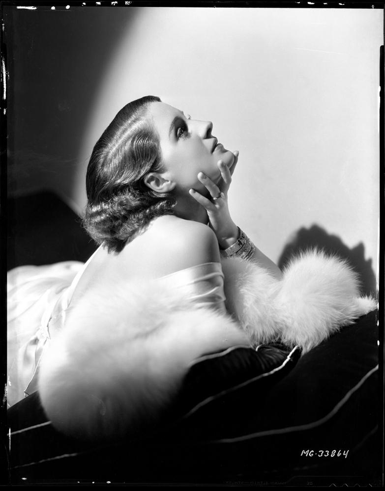 (M-G-M, 1934) Black-and-white 8 x 10 in. camera negative on nitrate film of Norma Shearer from Riptide by George Hurrell; with EASTMAN-NITRATE-KODAK etched on the border, MG-33864 in India ink and retouching. Fine; with 1 in. tear at the lower left corner edge and smudges at the upper left.