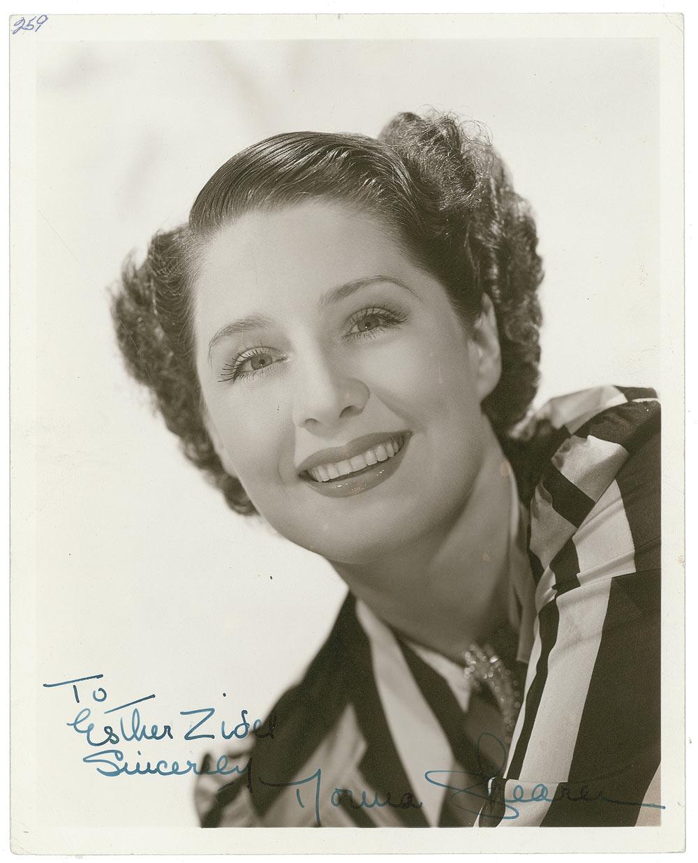 Vintage matte-finish 8 x 10 close-up photo of the smiling actress, signed and inscribed in fountain pen “To Esther Zidel, Sincerely, Norma Shearer.” In fine condition with corner creases, a few spots of soiling, and a handwritten numeral at the upper left corner.