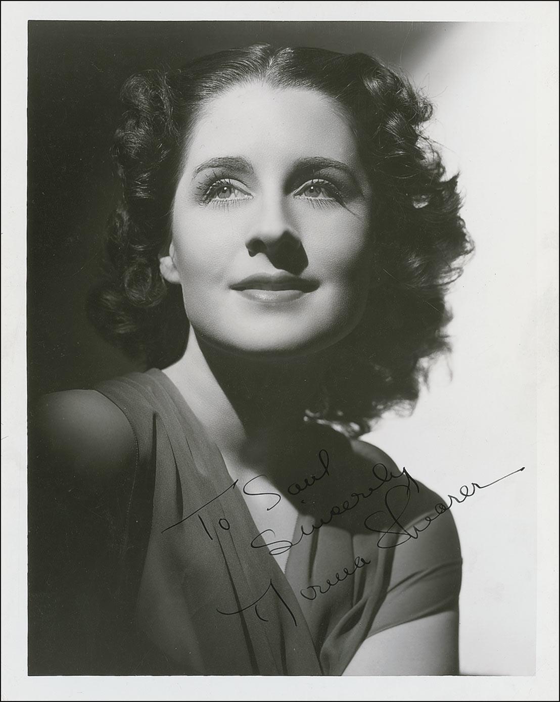 Vintage pearl-finish 8 x 10 MGM publicity Hurrell photo, signed and inscribed in-person in fountain pen “To Saul, Sincerely, Norma Shearer.” Reverse of photo bears collector’s stamp date of September 3, 1938, the date the signature was acquired. Reverse also bears an affixed promotional caption regarding her upcoming film, Romeo and Juliet. In fine condition, with a few light corner tip creases. Saul Goodman Collection.
