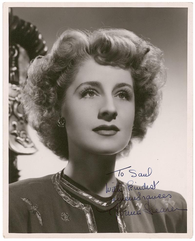 Sophisticated vintage matte-finish 8 x 10 head-and-shoulders photo, signed and inscribed in-person in fountain pen, “To Saul, With kindest remembrances, Norma Shearer.” In fine condition, with light rippling at both the top and bottom edge, and trivial creasing. Saul Goodman Collection.