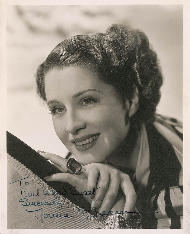 Beautiful vintage matte-finish 8 x 10 photo, signed and inscribed in fountain pen “To Paul Ward Susat, Sincerely, Norma Shearer.” In fine condition, with trivial corner tip creases, mild soiling to the borders, and slight rippling to the top edge.