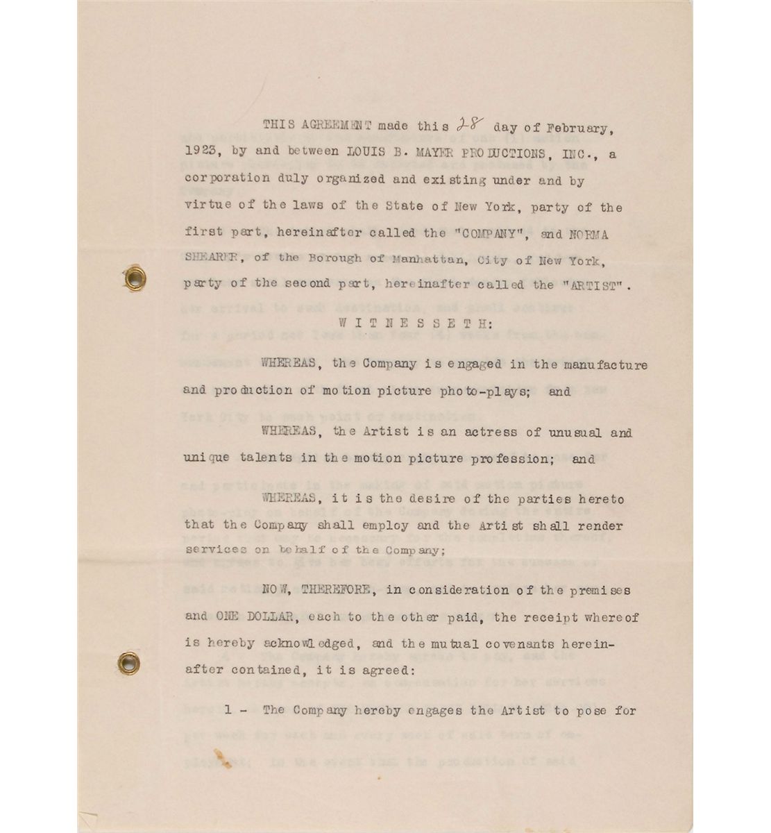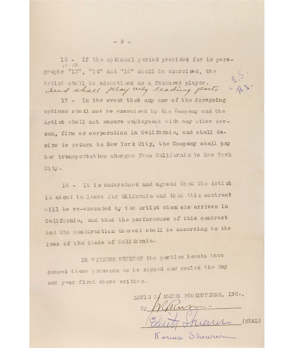 DS, nine pages, 8 x 10.5, February 28, 1923. Contract between Shearer and Louis B. Mayer Productions, Inc. In part: “The Company hereby engages the Artist to pose for and participate in the manufacture of one (1) motion picture photo-play…The Artist shall immediately proceed to the Company’s studio at Los Angeles…The Artist hereby engages herself to pose for and participate in the making of said motion picture photo-play…and agrees to give her best efforts for the success of said motion picture photo-play, and to perform her services in a careful and painstaking manner…The Company hereby agrees to pay…the sum of…$250 per week for each and every week of said term of employment.” The contract also stipulates that if certain requirements are met, “The Artist shall be advertised as a featured player and shall play only leading parts.” Signed at the conclusion in purple ink by the actress, “Norma Shearer,” her mother, “Edith Shearer,” and in black ink by Mayer Productions general counsel J. Robert Rubin. The final page is also initialed by both Shearer and her mother. In fine condition, with expected document wear. Shearer was initially ‘discovered’ by young MGM producer Irving Thalberg, who arranged for her first screen test, and was one of her greatest advocates in securing roles for her before she became a star; the pair would go on to get married in 1927. This document was the 20-year-old Shearer’s very first major film contract, under which her first film was Pleasure Mad, followed by a leading role in The Wanters.