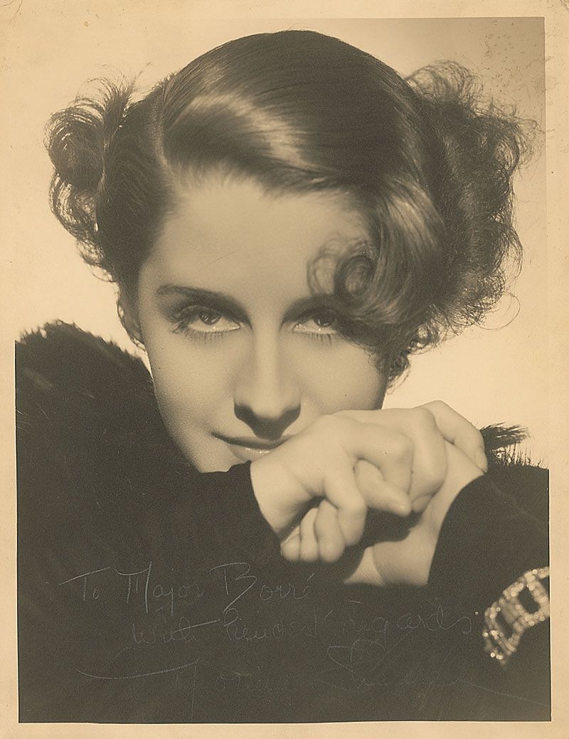Seductive oversized vintage matte-finish 10 x 13 Hurrell MGM publicity photo, signed and inscribed in white artist’s pencil, “To Major Borre, with kindest regards, Norma Shearer.” In very good condition, with scattered light creases (mostly to edges), slight toning, moderate contrast against the dark background, and some scattered soiling, heavier at upper right corner.