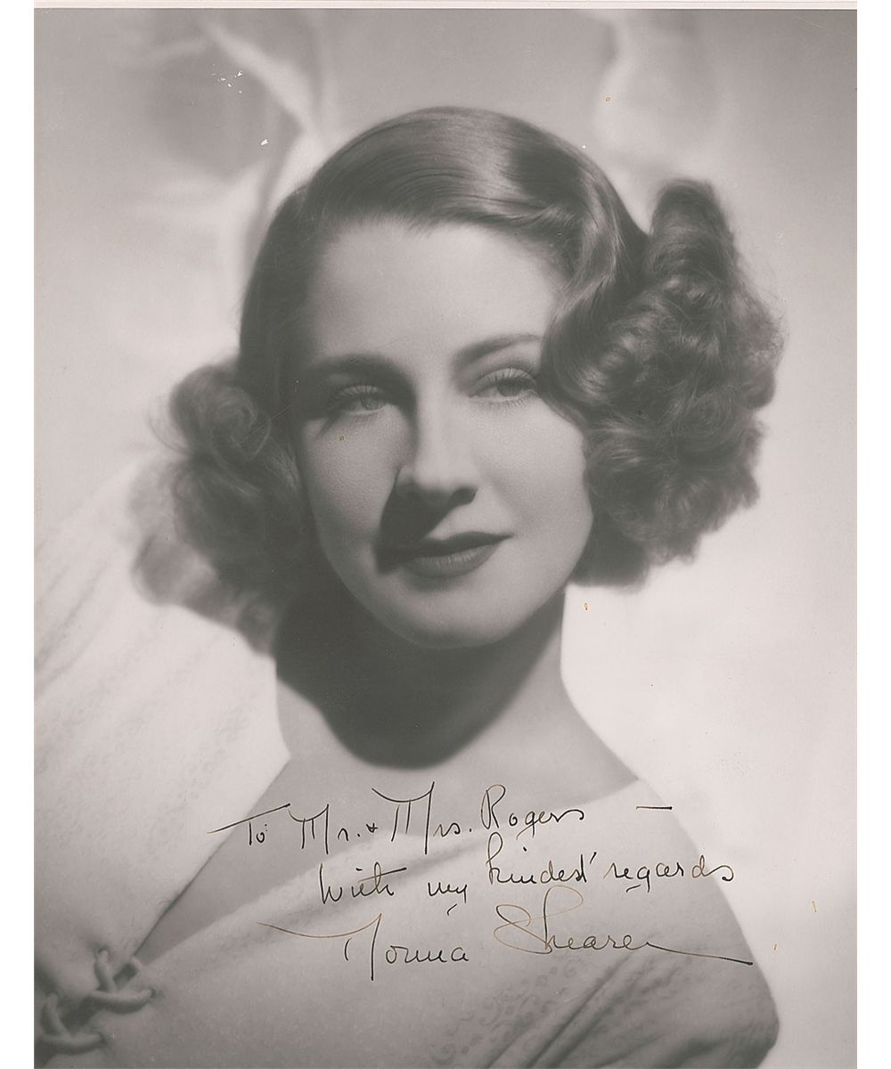 Vintage matte-finish 10.25 x 13.5 photo, signed and inscribed in fountain pen, “To Mr. & Mrs. Rogers—with my kindest regards, Norma Shearer.” Trimmed edges, a couple corner tip creases, and a few small spots of surface loss to background near top edge, otherwise fine condition.