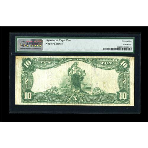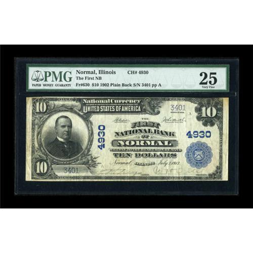 <B>Normal, IL</B></I> - $10 1902 Plain Back Fr. 630 <B>The First NB</B></I> Ch. # 4930<BR> One of only three large notes reported from this McLean county bank, which was the only issuer in town. Acquiring a note from Normal has been anything but, as even the Lonnon, Shaw, and Herget collections of Illinois Nationals all lacked a large note from this location. <B>PMG Very Fine 25.</B></I><BR><BR><b>Shipping:</b> Coins & Currency (<a target="_blank" href="http://www.heritageauctions.com/common/shipping.php">view shipping information</a>)