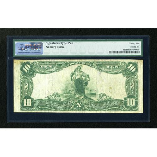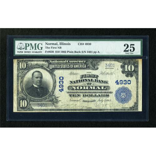 <B>Normal, IL</B></I> - $10 1902 Plain Back Fr. 630 <B>The First NB</B></I> Ch. # 4930<BR> This attractive $10, which has been certified as <B>PMG Very Fine 25</B></I>, is one of only three large size reported for this McLean County bank. The only issuer in town, acquiring a note from Normal has been anything but, as even the Lonnon, Shaw, and Herget collections of Illinois nationals all lacked a large size note from this location. <BR><BR><b>Shipping:</b> Coins & Currency (<a target="_blank" href="http://www.heritageauctions.com/common/shipping.php">view shipping information</a>)
