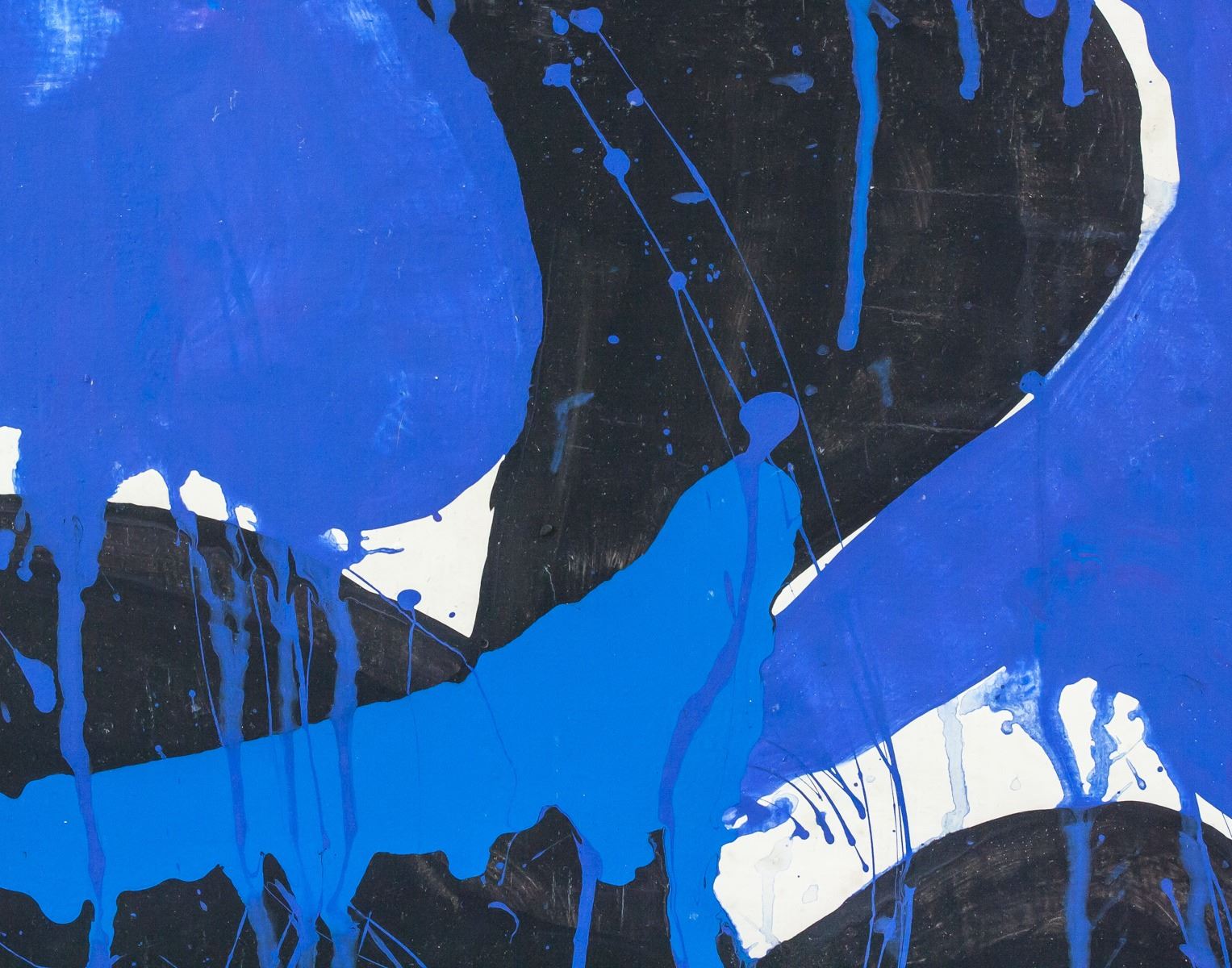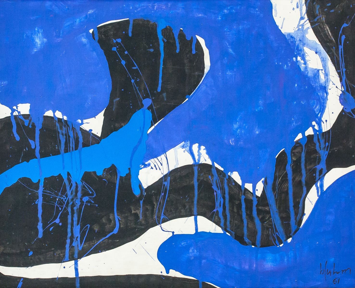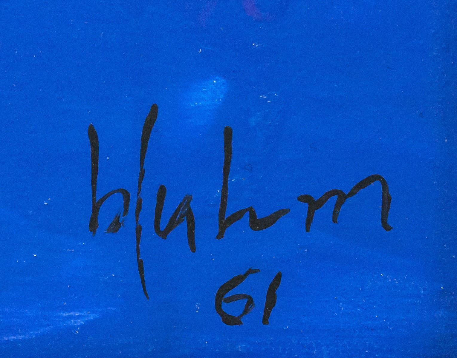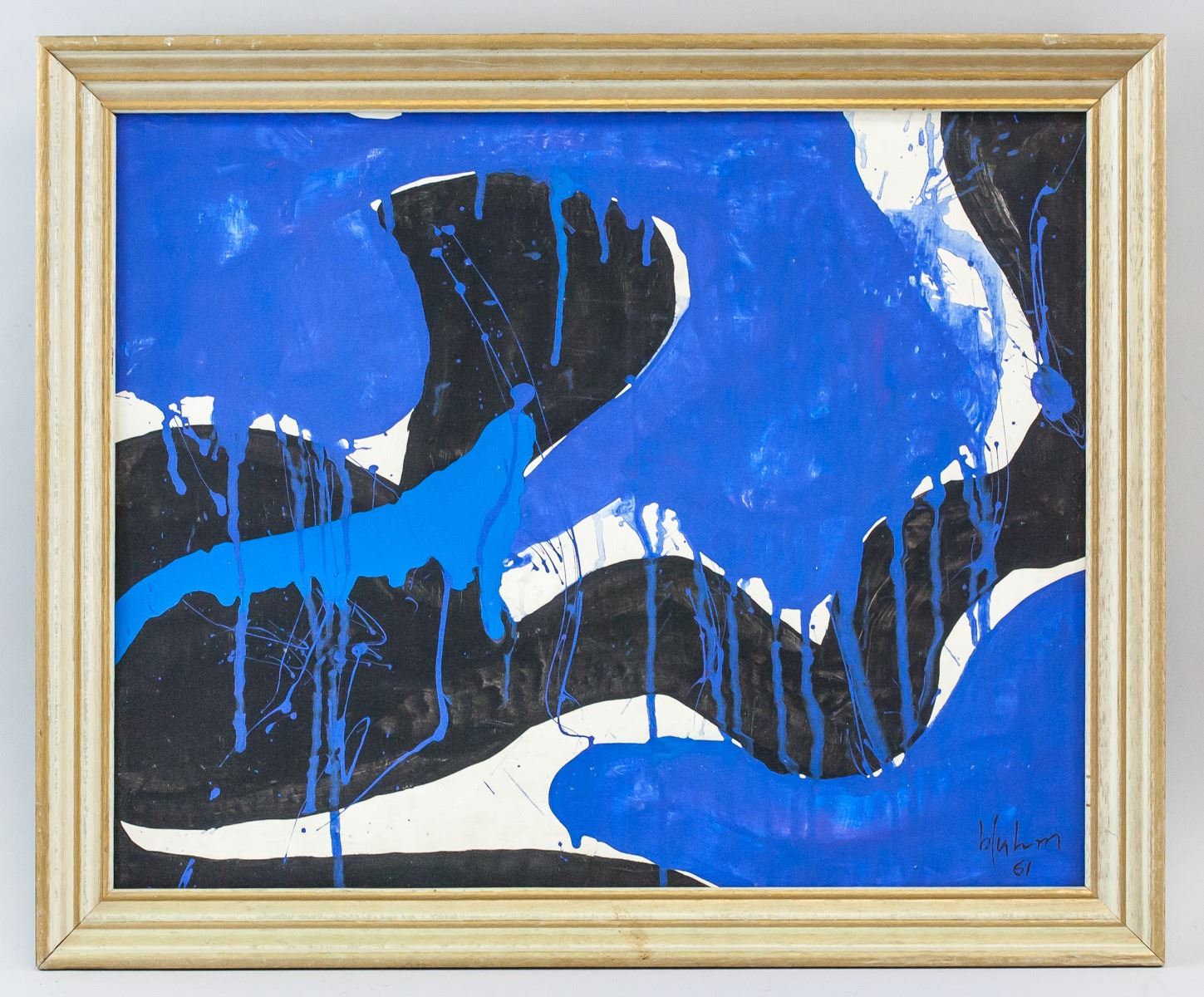 Oil on canvas, framed. featuring an abstract expressionist composition. Signed bluhm and inscribed 61 underneath signature on the lower right corner. Attributed to Norman Bluhm (1921-19991, American). 41 x 51 cm (16 x 20 in), Frame: 27 x 57 cm (18.5 x 22.5 in). PROVENANCE: This lot carries limited provenance from a Southern Ontario estate