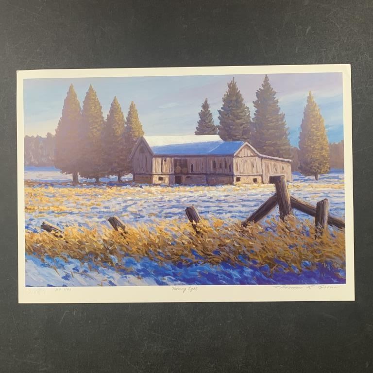 Norman Brown's "Morning Light" limited edition AP print, signed lower right and numbered 1/45 AP lower left. A lovely scene of a cabin in the winter with tree behind it. This piece is in great condition with a wrinkle upper right.