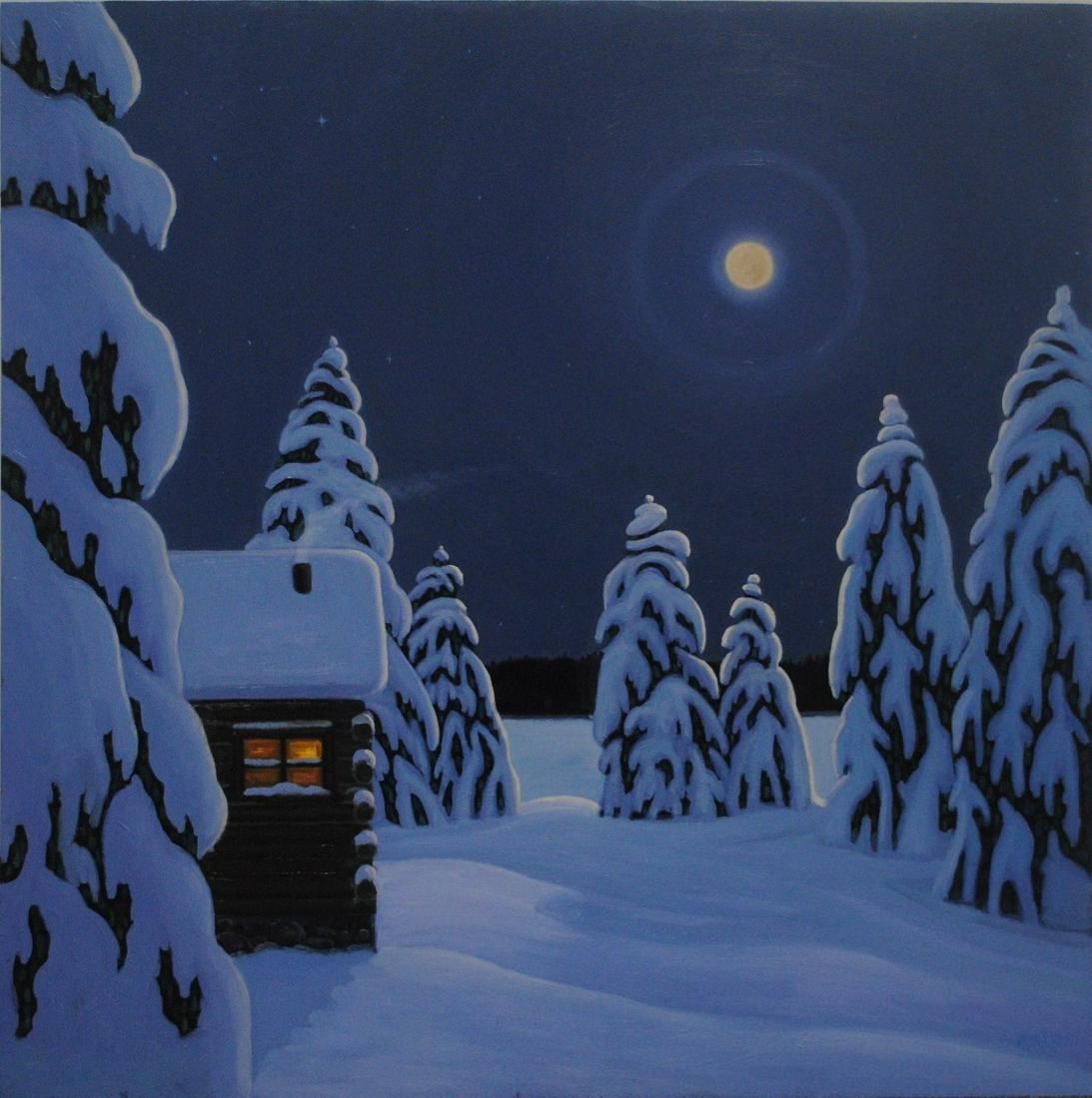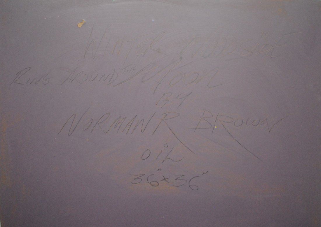 Norman Brown's "Winter Woodside- Ring Around The Moon" original oil on masonite. Image- 36" x 36"