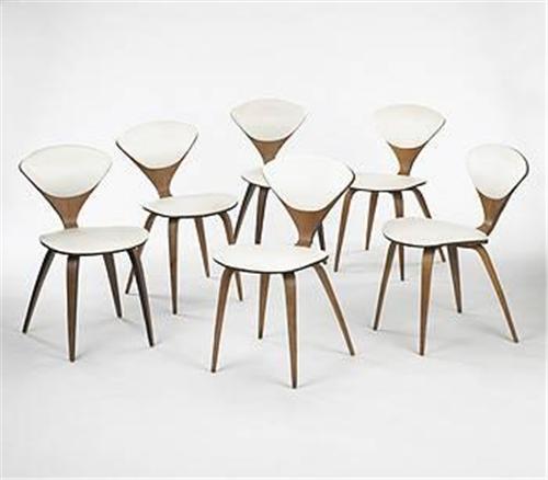 Norman Cherner dining chairs, set of six Plycraft USA, c. 1955 walnut plywood, vinyl 17.5"w x 21.5"d x 31"h Matched set of six dining chairs. Manufacturer's paper label to one example.