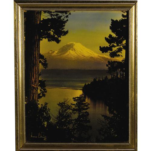 <B>Norman Edson Original Hand Tinted Orotone of Mount Rainier</B></I> signed "Norman Edson ©" in the lower left and in the original frame. Photo sight size is 10.5" x 13.5" and overall frame size is 12.5" x 15.5". Norman S. Edson (1876-1968), the son of painter Allan Edson, was not only a photographer but a painter, poet, and violinist as well. He spent much of his photographic career based in the Seattle area and is known for his colorful hand-painted images and orotones of Mount Rainier. It's difficult to imagine a finer representation of his work than this present lot. The orotone (goldtone) process gives it an amazing depth and the judicious use of color adds to the ethereal quality of this image. Excellent condition.<BR><BR><b>Shipping:</b> Framed - with Glass, Medium (<a target="_blank" href="http://www.heritageauctions.com/common/shipping.php">view shipping information</a>)