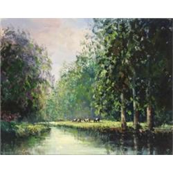 Norman J. McCaig (1929-2001) CATTLE GRAZING, RIVER LAGAN signed lower left; inscribed on re...