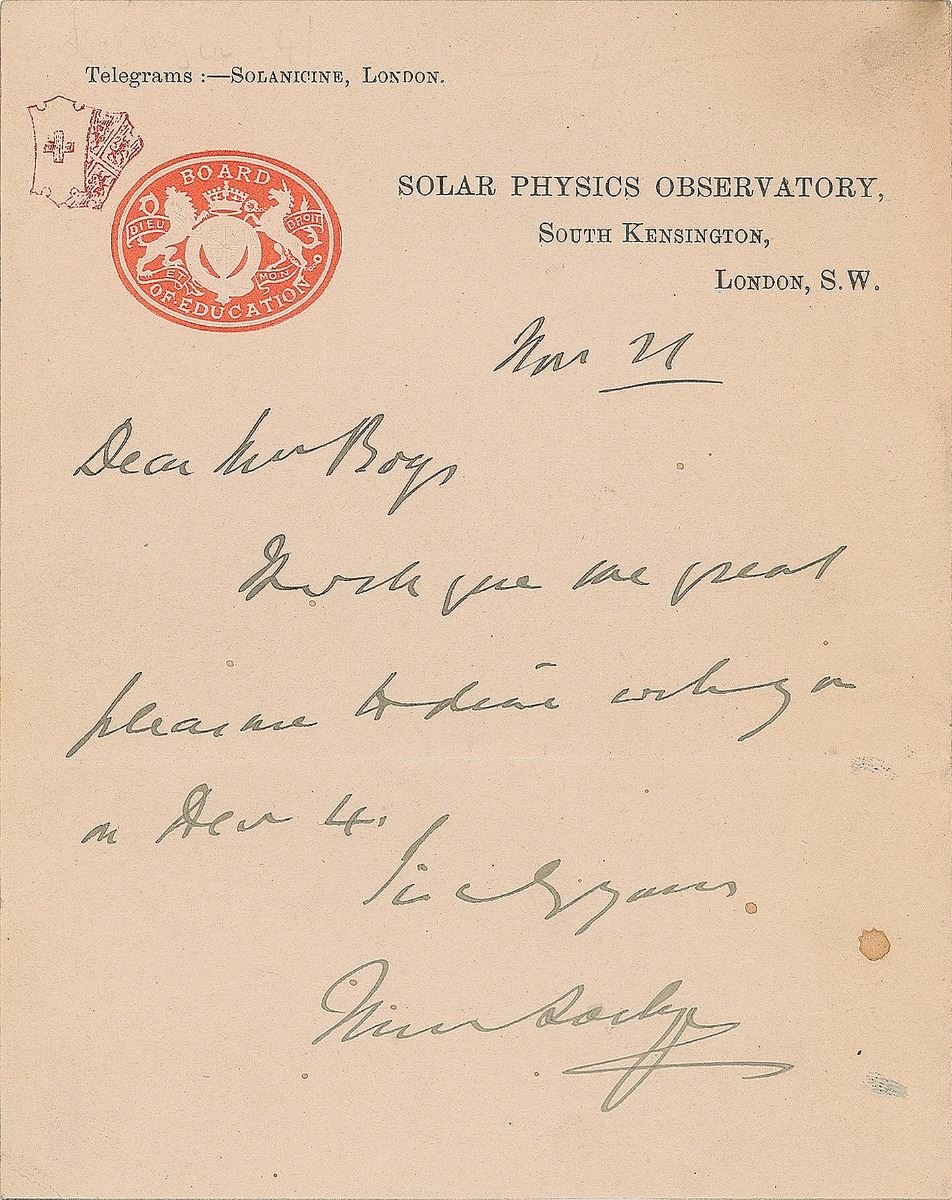 English scientist and astronomer (1836–1920) credited with Pierre Janssen as the co-discoverer of helium. Uncommon ALS, one page, 4.5 x 5.75, Solar Physics Observatory letterhead, November 21, no year. Response to an invitation, in full: “It will give me great pleasure to dine with you on Dec. 4.” In fine condition, with a few small stains affecting nothing.