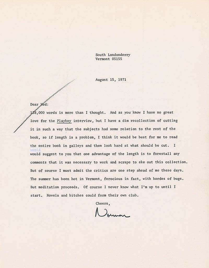 TLS signed “Norman,” one page, 8.5 x 11, August 15, 1971. Letter to his editor at Little, Brown and Co. In full: “128,000 words is more than I thought. And as you know I have no great love for the Playboy interview, but I have a dim recollection of cutting it in such a way that the subjects had some relation to the rest of the book, so if length is a problem, I think it would be best for me to read the entire book in galleys and then look hard at what should be cut. I would suggest to you that one advantage of the length is to forestall any comments that it was necessary to work and scrape to eke out this collection. But of course I must admit the critics are one step ahead of me these days. The summer has been hot in Vermont, ferocious in fact, with hordes of bugs. But meditation proceeds. Of course I never know what I’m up to until I start. Novels and bitches could form their own club.” In fine condition, with intersecting folds and a pencil line through greeting. The suggestions Mailer discusses in this letter are for Existential Errands, a collection of twenty-eight selections from his writings over a five-year period, published in 1972. The subjects include boxing, bullfighting, movies, foreign wars, black power, his famous account of the Ali-Frazier fight, and the making of his movie, Maidstone.