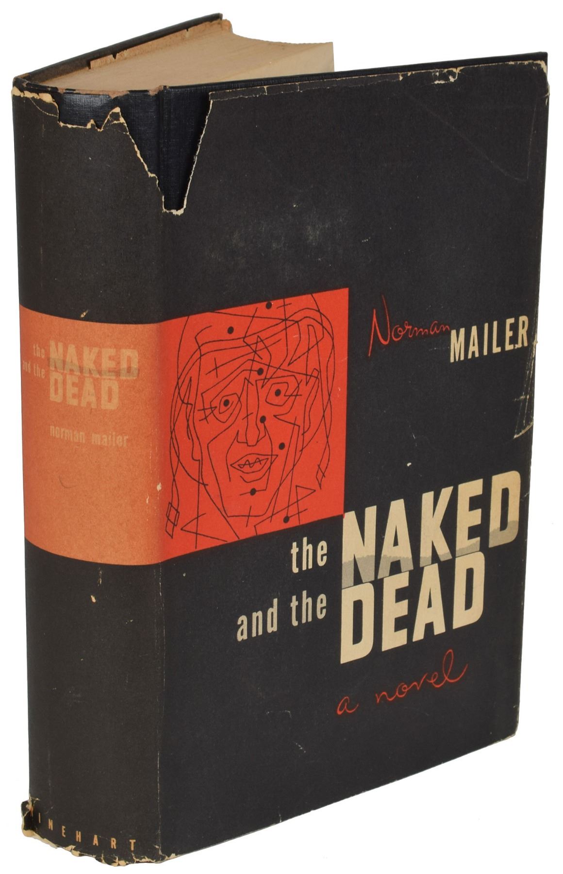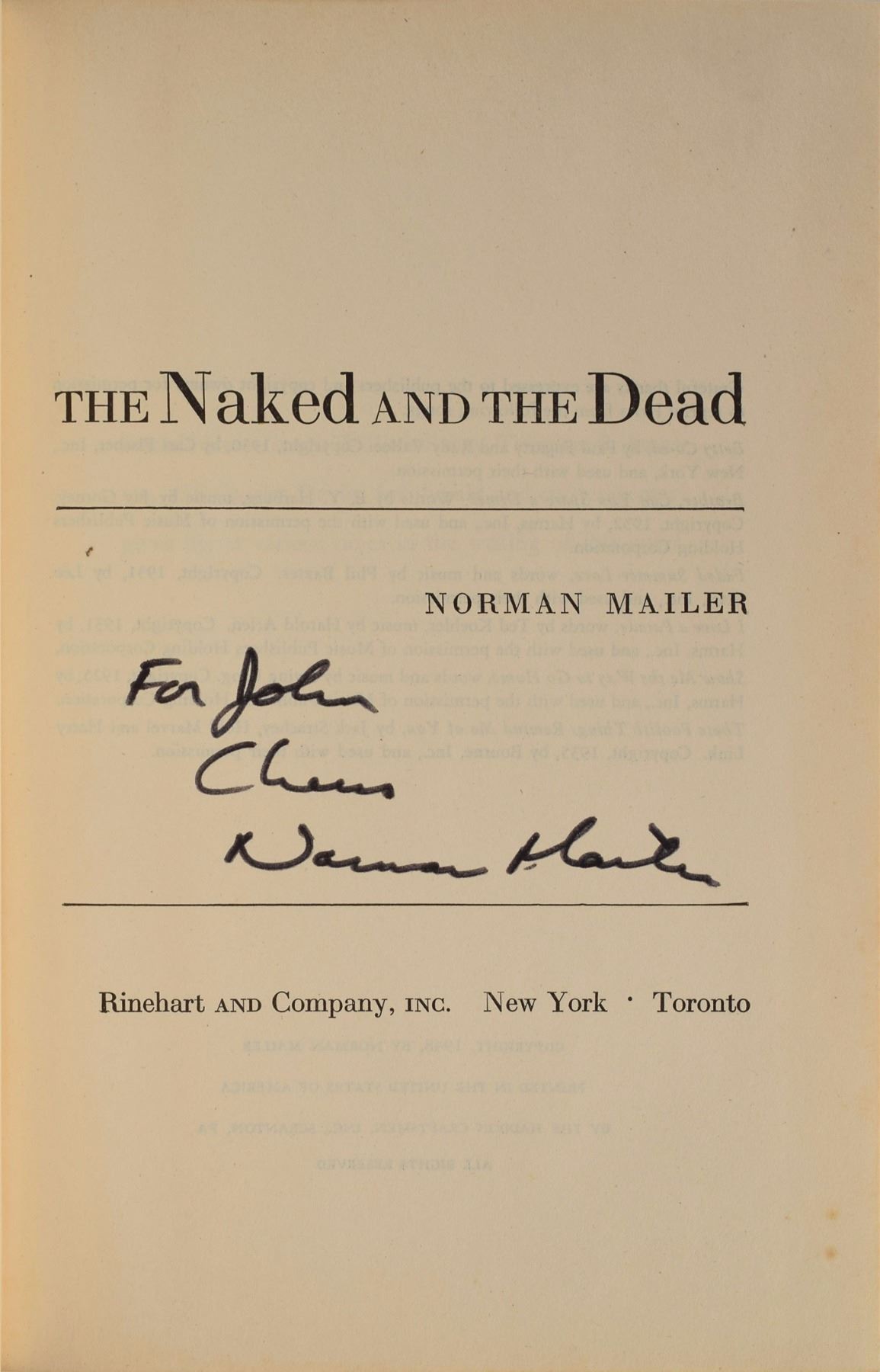 Signed book: The Naked and the Dead. NY: Rinehart & Company, Inc., 1948. Hardcover with dust jacket, 5.75 x 8.5, 721 pages. Signed and inscribed on the title page in black felt tip, “For John, Cheers, Norman Mailer.” In fine condition, with notable wear and paper loss to dust jacket.