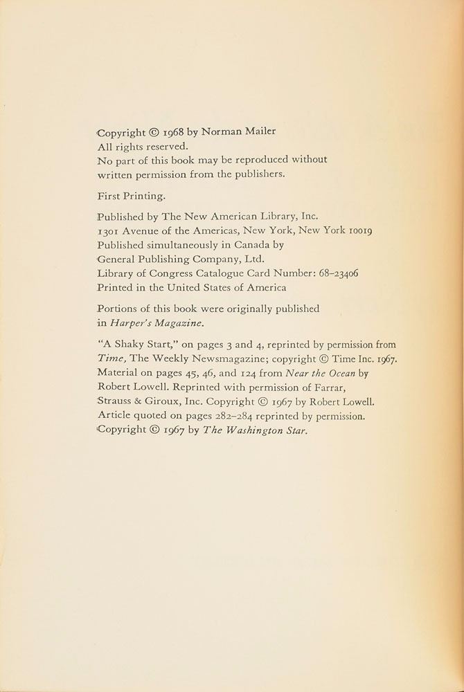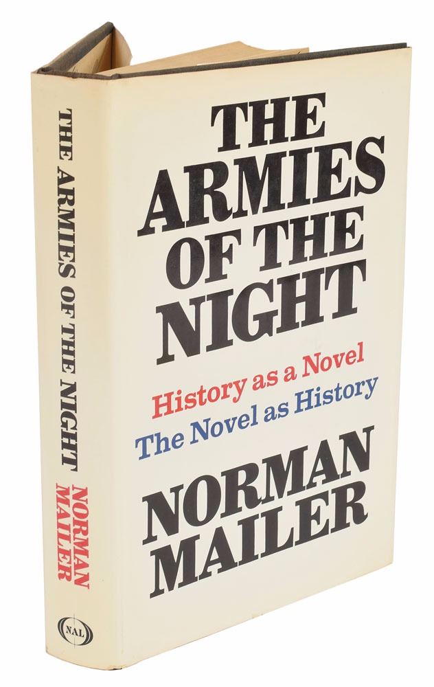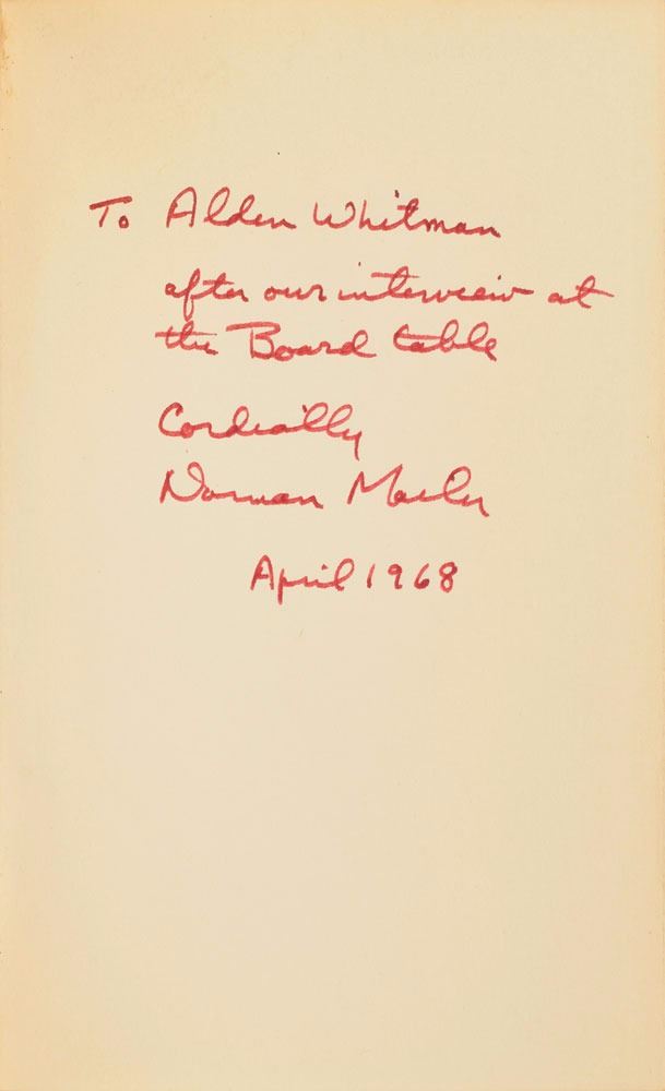 Two first edition books: Deaths for the Ladies, hardcover with dust jacket, published by G. P. Putnam's Sons in 1962, signed on the half-title page in felt tip, "Norman Mailer"; and The Armies of the Night, hardcover with dust jacket, published by The New American Library in 1968, signed and inscribed on a free end page in felt tip, "To Alden Whitman, after our interview at the Board table, Cordially, Norman Mailer, April 1968." In overall very good to fine condition, with light wear to the dust jacket of Deaths for the Ladies.