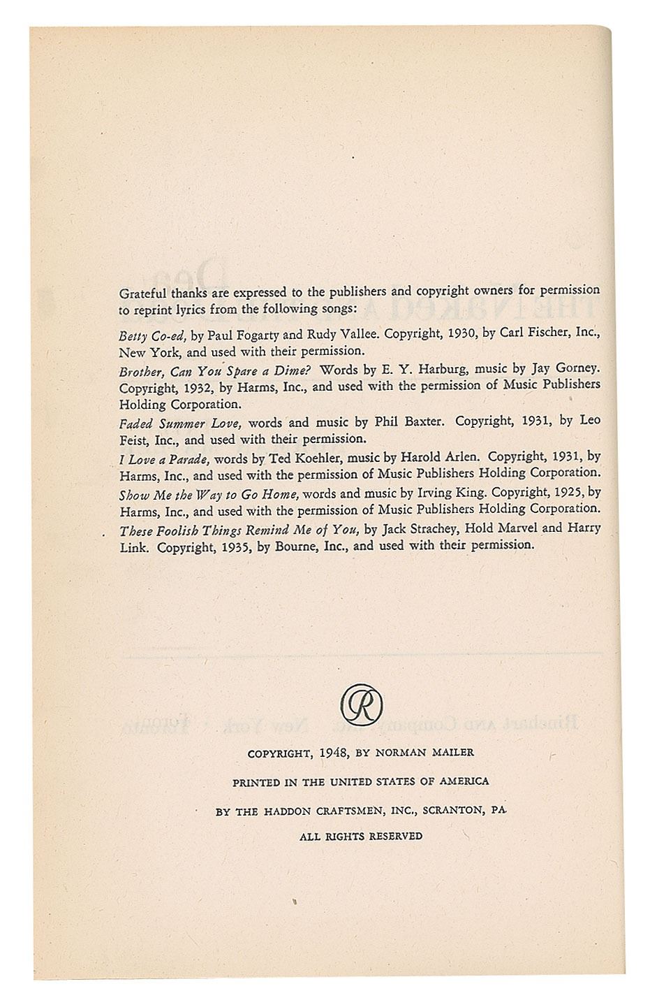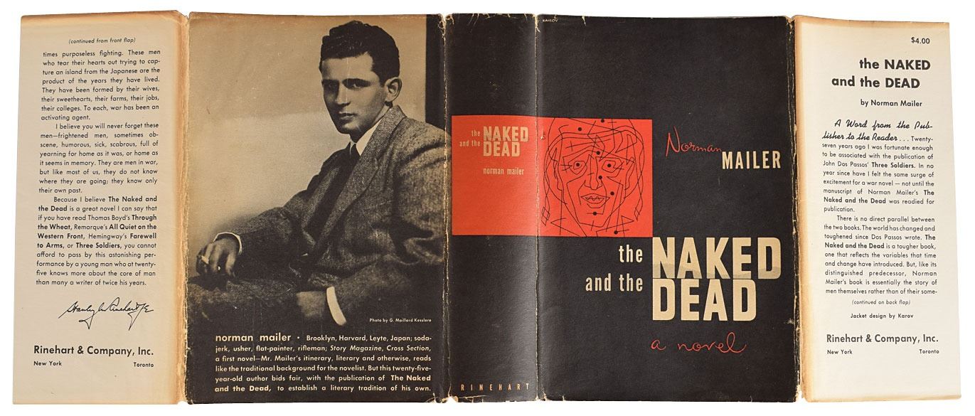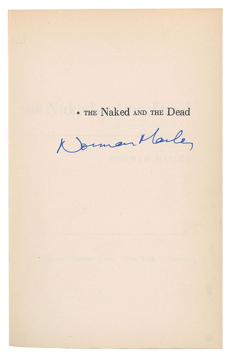 Signed book: The Naked and the Dead. First edition. NY: Rinehart and Company, 1948. Hardcover with dust jacket (with Rinehart logo on copyright page and $4.00 price on front flap), 6 x 8.5, 721 pages. Signed on the half-title page in blue felt tip, "Norman Mailer." Autographic condition: fine. Book condition: VG/VG, with slight nicks and edge toning to dust jacket. A sought-after signed example of Mailer's classic WWII novel, which ranked 51st on Modern Library's list of the 100 best English-language novels of the 20th century.