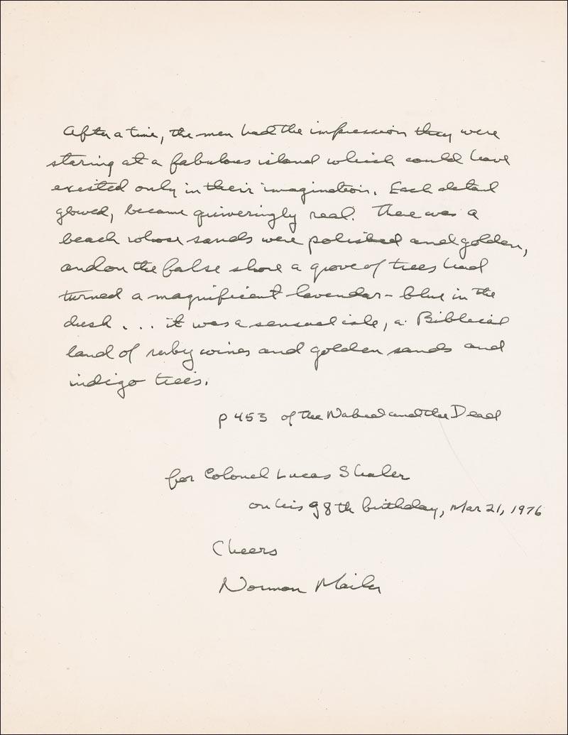 AQS on an 8.5 x 11 off-white sheet. Mailer pens a quote from page 453 of his book The Naked and the Dead. Quote concludes: “It was a sensual isle, a Biblical land of ruby wines and golden sands and indigo trees.” Signed and inscribed at the conclusion, “For Colonel Lucas Shaler on his 98th birthday, Mar 21, 1976, Cheers, Norman Mailer.” In fine condition, with a few light creases and wrinkles.