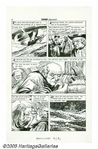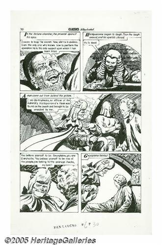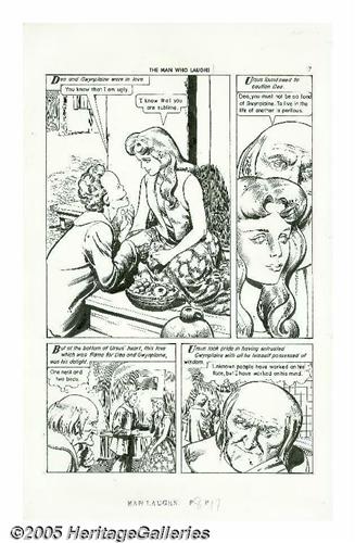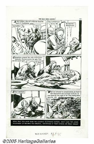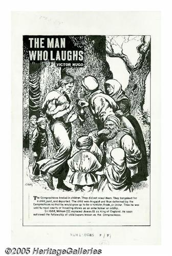 <B>Norman Nodell - Classics Illustrated #71, Complete 45-page Story, "The Man Who Laughs" Original Art (Gilberton, 1962).</B></I> Norman Nodell detailed Victor Hugo's poignant tale, <B>The Man Who Laughs</B></I>, with his sinuous ink line. Here's an interesting side note for comic book fans: Hugo's story served as the basis for a 1928 silent film starring Conrad Veidt as Gwynplaine, "the man who laughs." Writer Bill Finger used a still from that film to inspire Bob Kane and Jerry Robinson's vision for the Joker. Nodell's version of Gwynplaine is very compelling. The pages of this yarn each have an image area measuring 12" x 18", and aside from a few lettering and art corrections, they average Excellent condition. Also included in with this lot are three pages of type-set text.