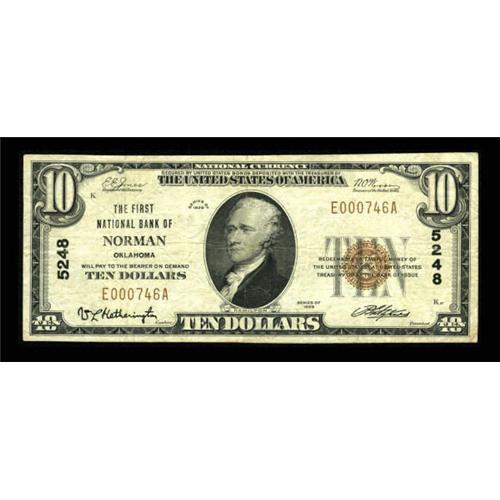 <B>Norman, OK</B></I> - $10 1929 Ty. 1 <B>The First NB</B></I> Ch. # 5248<BR> A nice evenly circulated example which is much superior to the vast majority of other small notes from here. <B>Fine-Very Fine.</B></I><BR><BR><b>Shipping:</b> Coins & Currency (<a target="_blank" href="http://www.heritageauctions.com/common/shipping.php">view shipping information</a>)