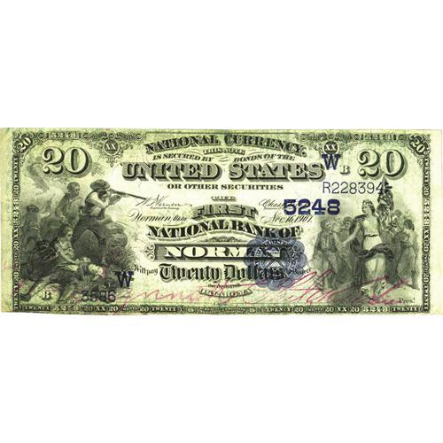 <B>Norman, OK</B></I> - $20 1882 Date Back Fr. 556 <B>The First NB</B></I> Ch. # (W)5248<BR>A very scarce early note from a much sought after bank. There is a bit of light soiling present, but this remains a more than acceptable example from a seldom seen bank. <B>Fine-Very Fine,</B></I> with bright red signatures adding to the note's appeal.