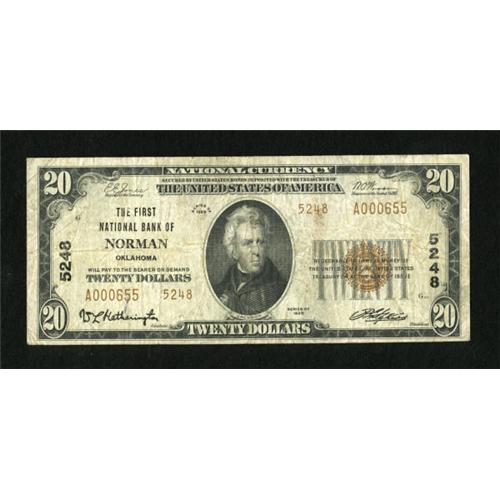 <B>Norman, OK</B></I> - $20 1929 Ty. 2 <B>The First NB</B></I> Ch. # 5248<BR> While not an exceptionally rare bank, notes from this location are avidly collected and seldom available, especially in Better grade. This Type 2 twenty is one of only two such examples listed in the census. <B>Fine+.</B></I><BR><I>From The Rolling Plains Collection</B></I><BR><BR><b>Shipping:</b> Coins & Currency (<a target="_blank" href="http://www.heritageauctions.com/common/shipping.php">view shipping information</a>)