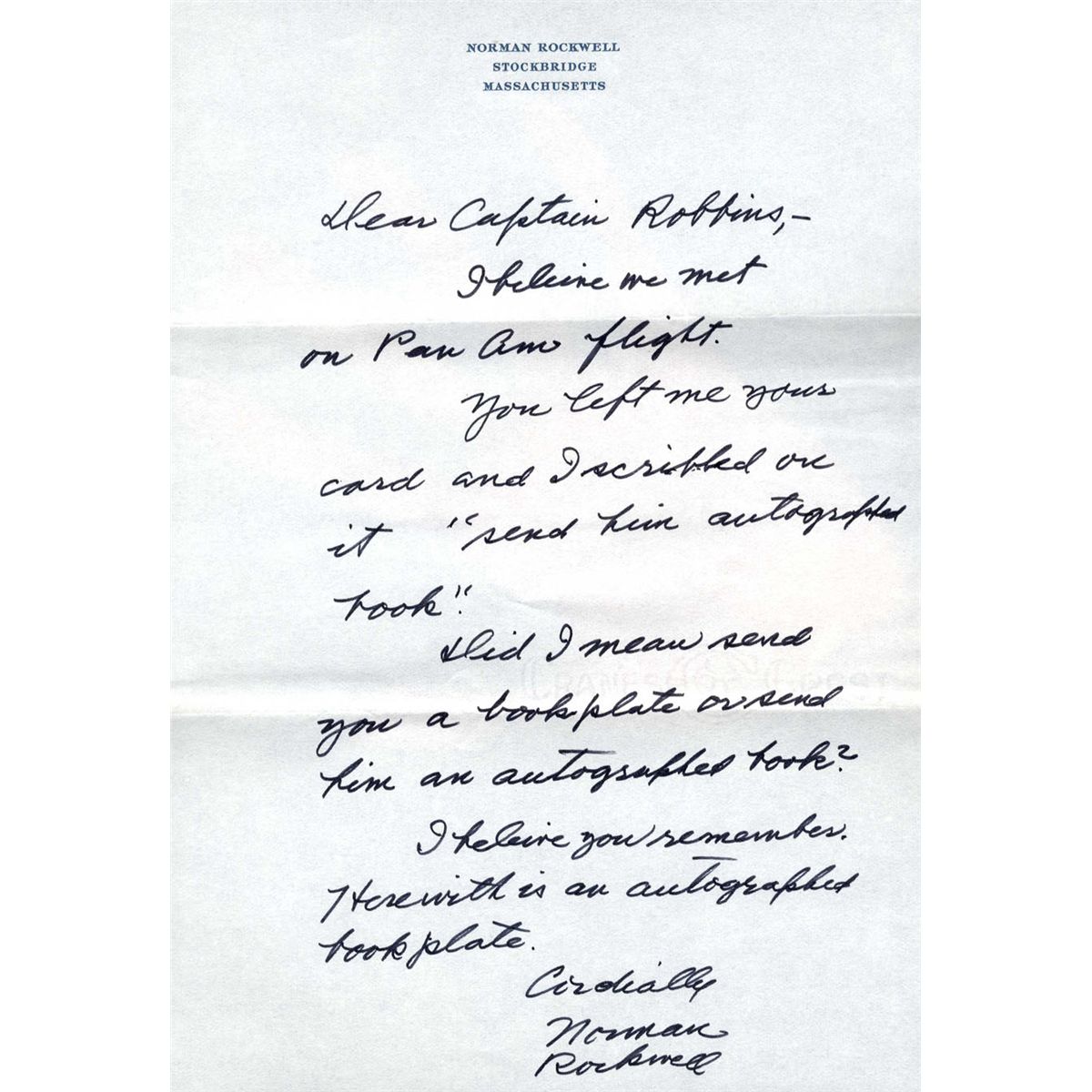 Norman Rockwell autograph letter signed on his personal Stockbridge stationery. Single page letter to a Capt. Robbins reads, ''I believe we met on Pan Am flight. You left me your card and I scribbled on it, 'send him autographed book.' Did I mean send you a bookplate or send him an autographed book? I believe you remember. Herewith is an autographed bookplate. Cordially, Norman Rockwell''. Includes envelope addressed in Rockwell's hand and typed letter initialed ''NR'', possibly by his secretary. 7.25'' x 10.5'' letter is near fine.