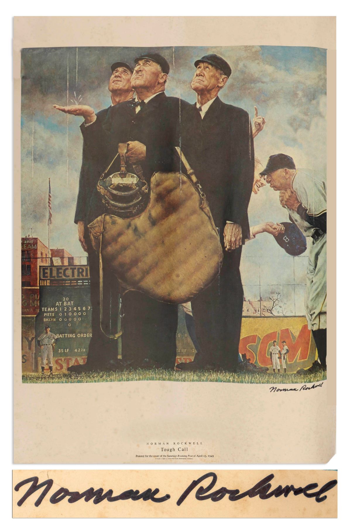 Norman Rockwell ''Tough Call'' poster, signed by Rockwell in black felt-tip on the bottom margin. This is one of Rockwell's more famous works, painted for the 23 April 1949 cover of ''The Saturday Evening Post'', and with the original painting displayed in Cooperstown. Poster was printed in 1949 by the Curtis Publishing Co. Measures 19'' x 24.875''. Some creasing, and moderate foxing to margins, overall very good condition.