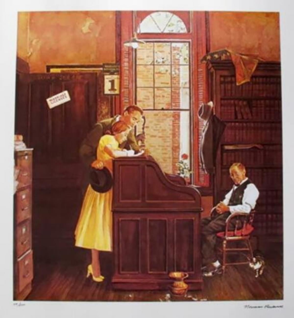 Norman Rockwell "Marriage Contract" Facsimile Signed, Limited Edition Numbered Lithograph Dimensions: 30 x 24 inches (Note: edition number received may differ from photo)