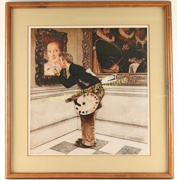 "Art Critic", signature lower right. Image measures 22"x20 1/2" in double mat and wood frame. Norman Rockwell was one of America's leading artists. He chose to tell the story of the American dream, the detail of a simpler time, painted with warmth and humor. He tapped into the nostalgia of the American people with paintings that were often idyllic and expressed enthusiasm for the ordinary.