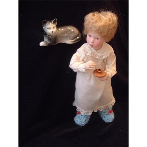 Adorable Norman Rockwell "Sally"; she is hand painted and numbered 1981; Sally is shown sneeking out of bed holding a candle with her favorite cat; She comes in her original box and has never been displayed