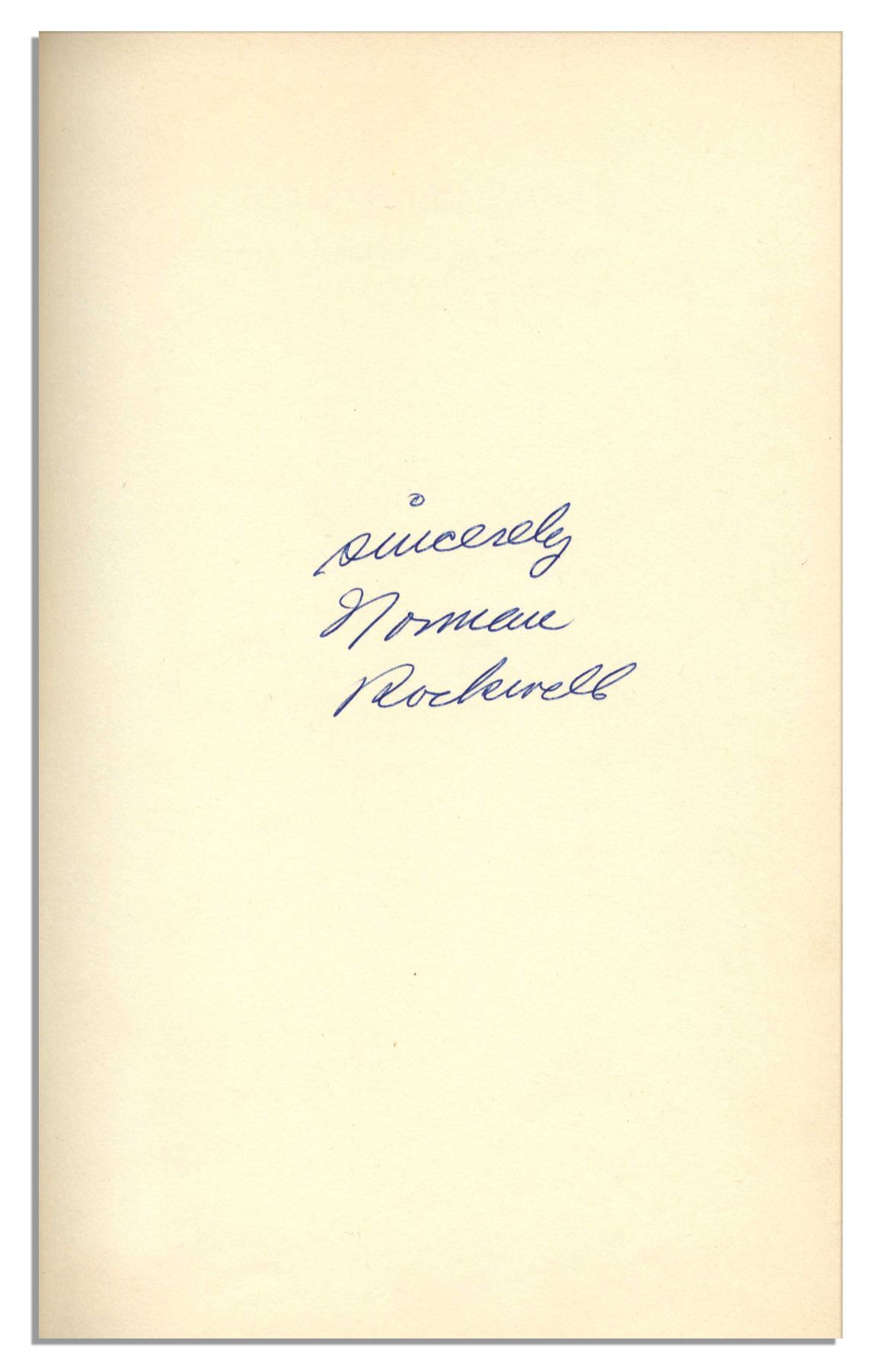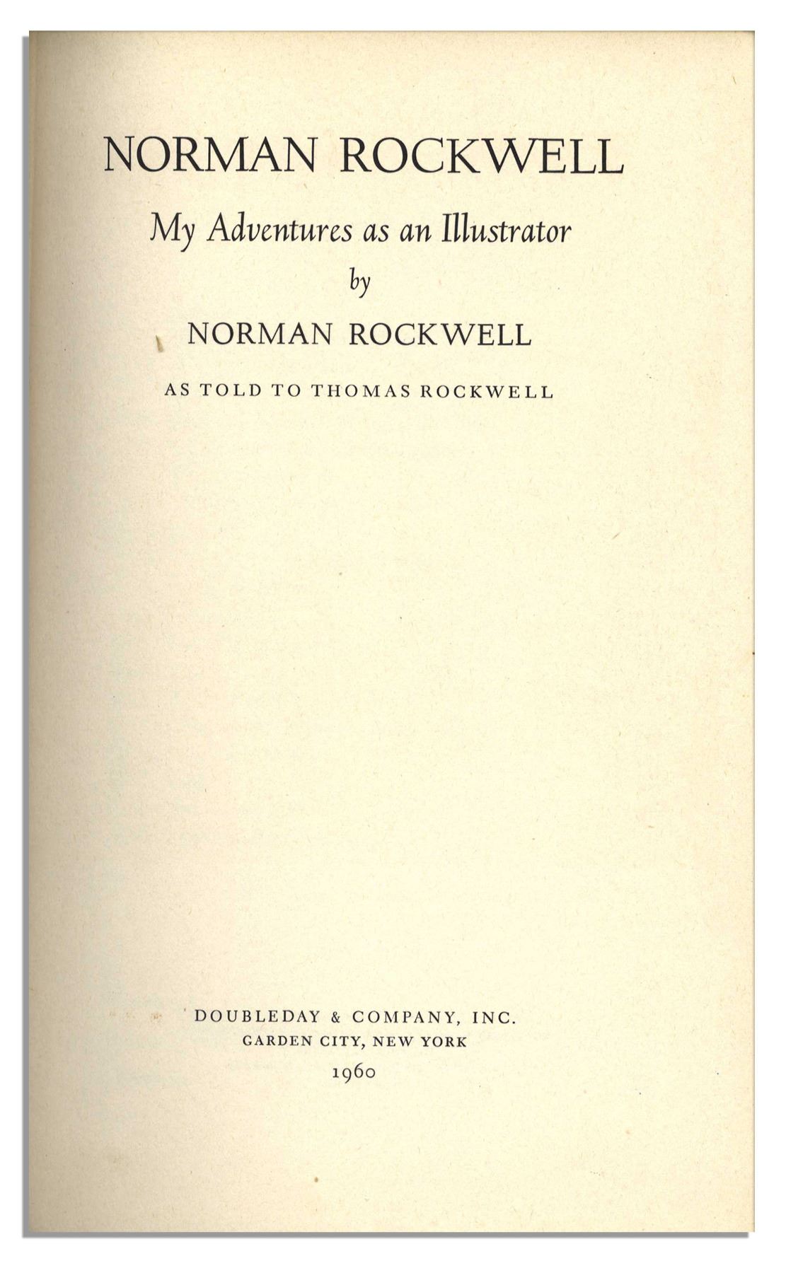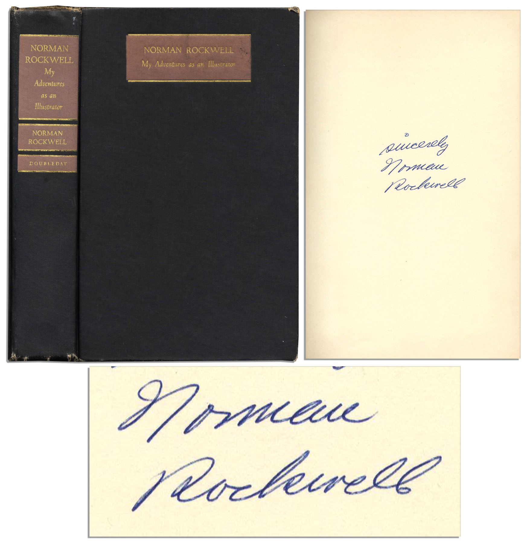 Norman Rockwell ''My Adventures as an Illustrator'' signed first edition. Published by Doubleday & Company: Garden City: 1960. Rockwell inscribes the fly-leaf, ''sincerely / Norman Rockwell'' in blue ink. Rockwell's account of his legendary career is peppered with full-color photos of Rockwell's famous paintings glorified in the ''Saturday Evening Post'' throughout the 20th century. Runs 436pp. Bound in black cloth boards with plum and gilt print, measuring 6.25'' x 9.5''. Cocking to spine and minor fabric loss to exterior edges and corners. Very good.