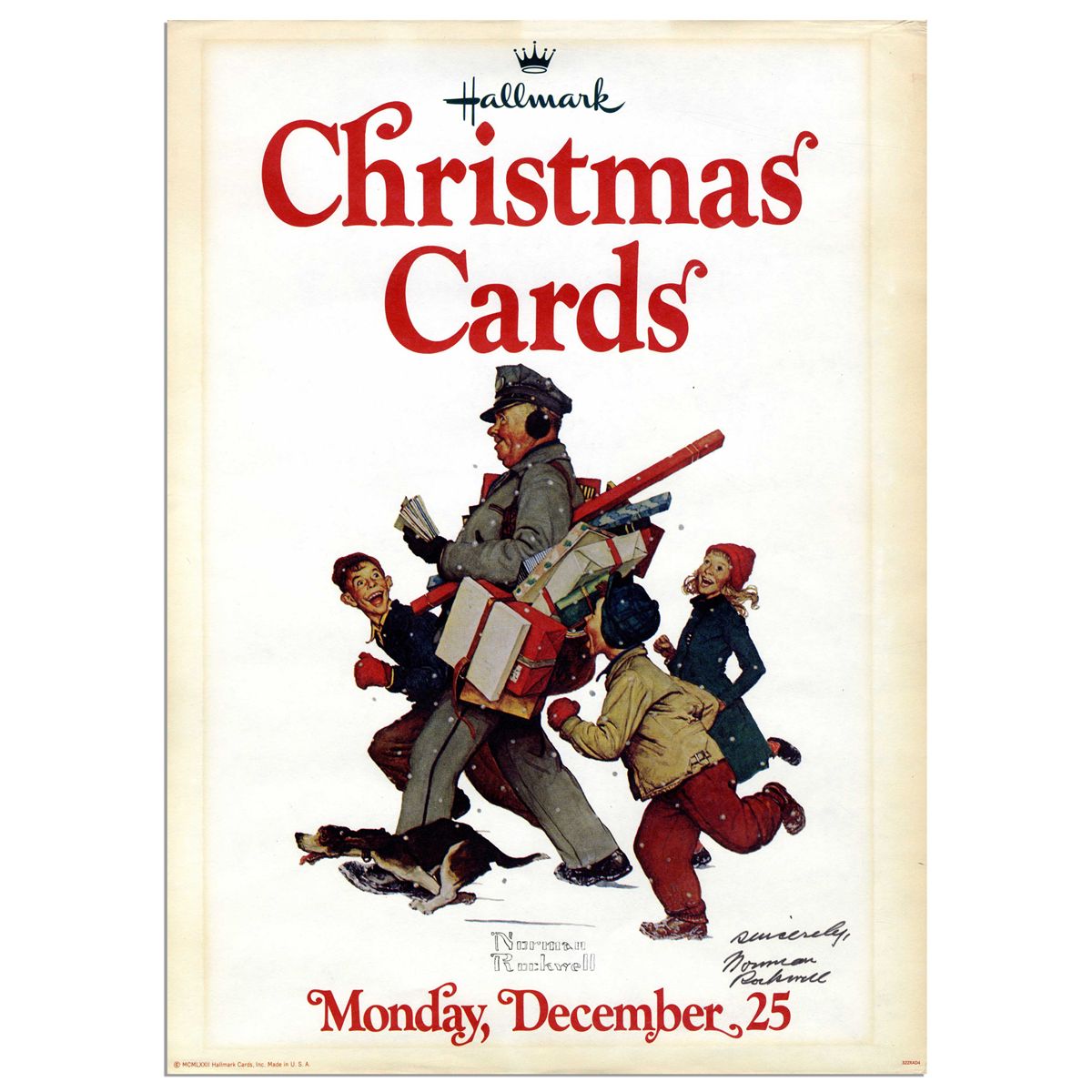 Hallmark Christmas Cards poster-size advertisement, featuring Norman Rockwell's ''Jolly Postman,'' signed by Rockwell. The popular painter and illustrator signs the 10'' x 14'' ad in the lower right: ''Sincerely, Norman Rockwell''. The ad, with a 1972 copyright, shows toning from previous framing and tape residue, else near fine.