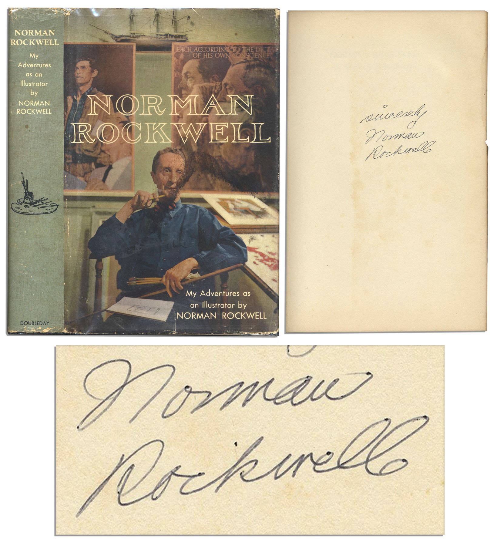 Norman Rockwell signed copy of his memoir, ''Norman Rockwell, My Adventures as an Illustrator'', published by Doubleday & Company, Inc.: Garden City: 1960. Volume is signed upon the fly-leaf, ''Sincerely, Norman Rockwell'' in blue ink. Rockwell's account of his prolific career as illustrator for the ''Saturday Evening Post'' features several black and white and full-color plates of Rockwell's famous paintings. Runs 436pp. Bound in black cloth boards with mauve block print and gilt lettering. Measures 6.25'' x 9.5''. Toning to leaves and wear to board edges; book is in very good condition. Toning, wear and creasing with a few small tears to edges of unclipped dust jacket, else near fine.