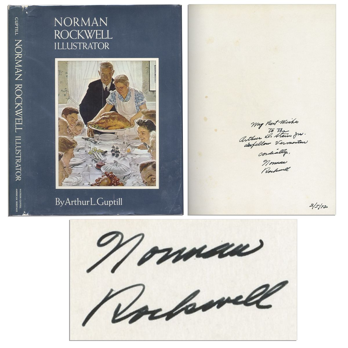 Norman Rockwell signed ''Norman Rockwell Illustrator'' by Arthur Guptill. Watson-Guptill: New York: 1971. Rockwell signs upon the front free endpaper, ''My best wishes to the Arthur D Stein Jrs. also fellow Vermonters / cordially, Norman Rockwell / 2/5/72''. This 25th anniversary edition of the 1946 book measures 9'' x 12'' and runs 208 pages. Unclipped dustjacket shows minor edge wear. Book has tight binding with only light toning. Overall very good condition.