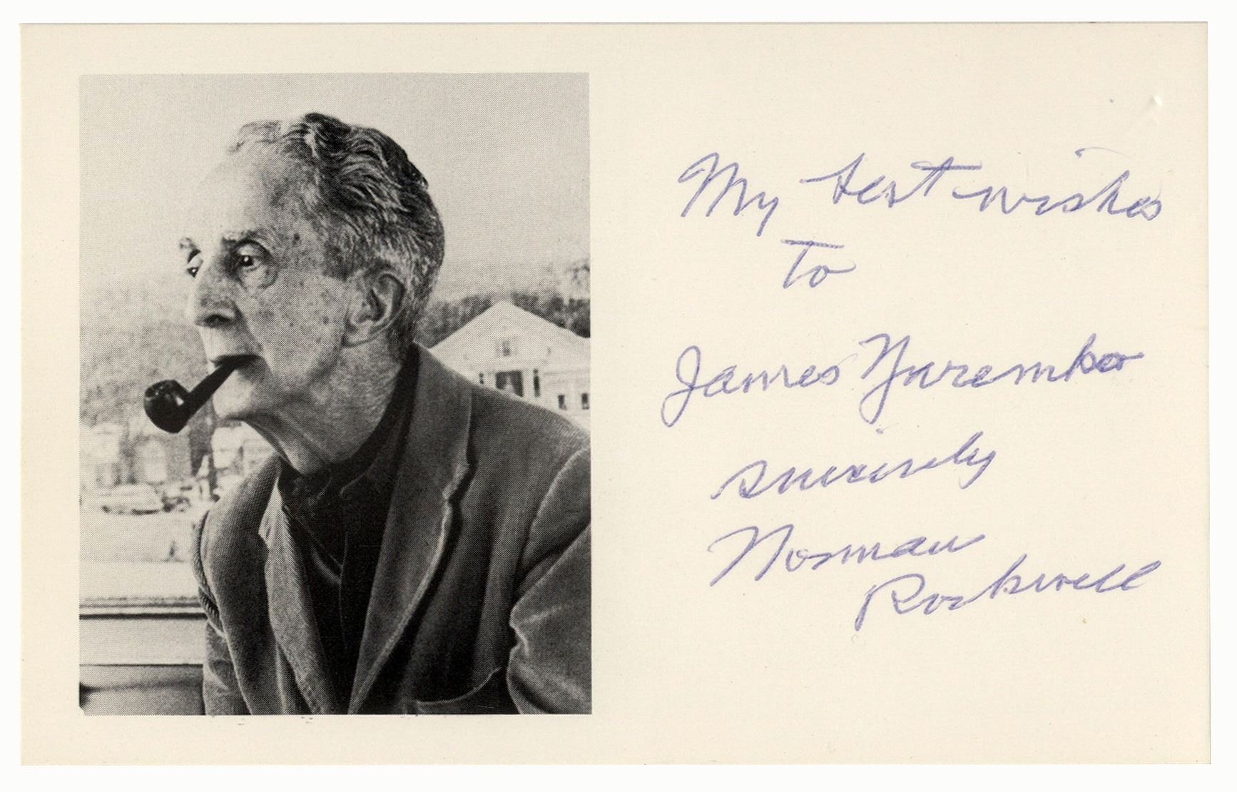 Norman Rockwell signed postcard, showing the famed illustrator smoking his pipe. Signed, ''My best wishes to James Yaremko / sincerely / Norman Rockwell''. Measures 5.5'' x 3.5''. A few small surface abrasions, otherwise near fine.
