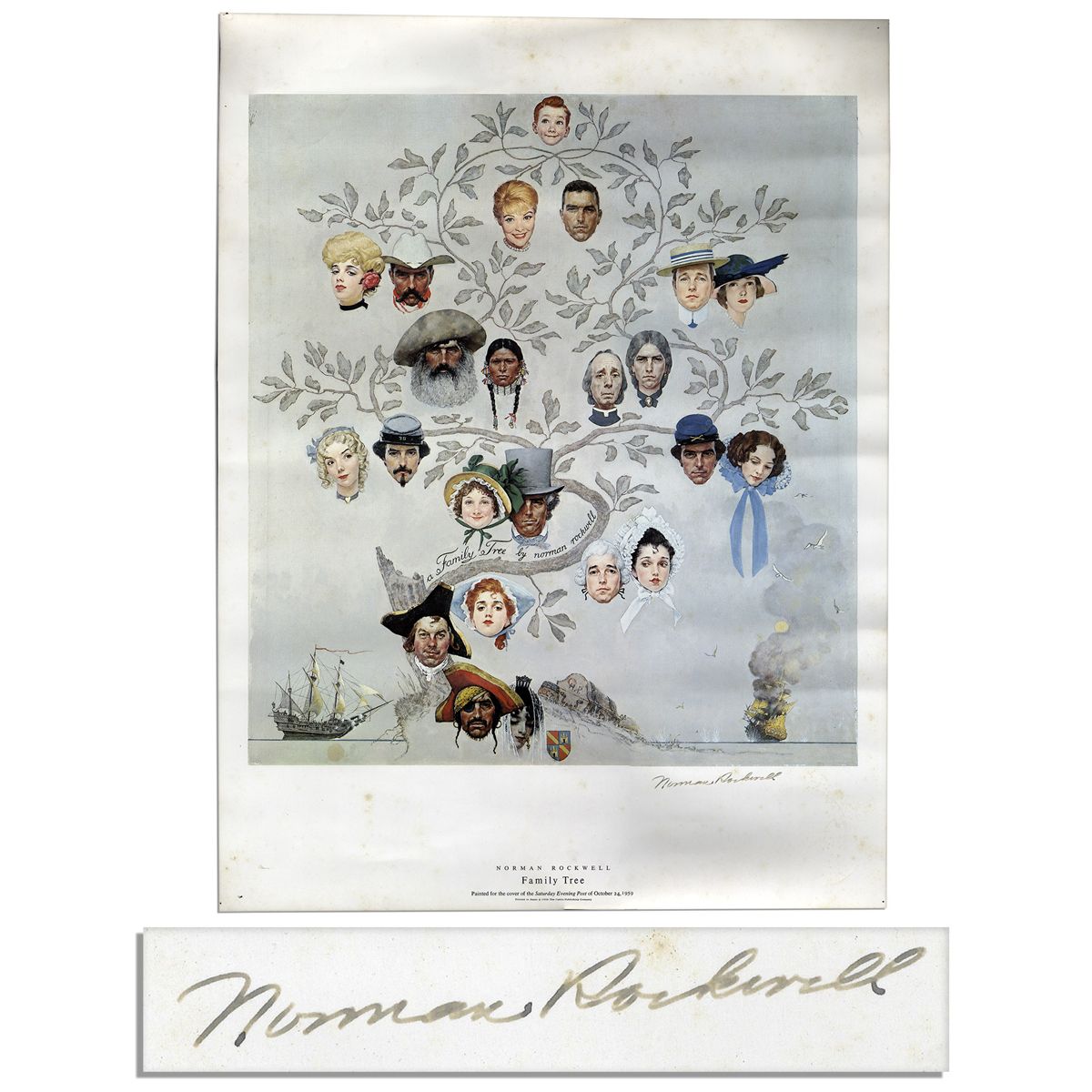 Print of ''Family Tree'' signed ''Norman Rockwell''. Ink signature appears to the lower right of the art, which served as the ''Saturday Evening Post'' cover art for its 24 October 1959 edition. Rockwell's depiction of a freckled boy's family tree converges at one point, with his parents apparently sharing a common ancestor as third cousins. Rockwell devotes nearly an entire chapter in his memoir, ''Norman Rockwell, My Adventures as an Illustrator'' to discussing his process in creating this piece for the Post. Measures 18.75'' x 24.75''. Pinholes to corners and minor foxing, with two light stains in the lower left quarter, else near fine.
