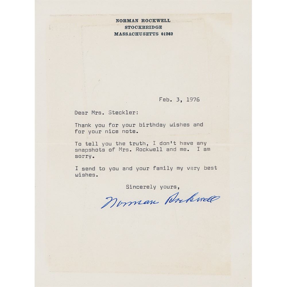 TLS, one page, 5.75 x 7.75, personal letterhead, February 3, 1976. Letter to Mrs. Eddie Steckler, in full: "Thank you for your birthday wishes and for your nice note. To tell you the truth, I don't have any snapshots of Mrs. Rockwell and me. I am sorry. I send to you and your family my very best wishes." In fine condition, with light toning from prior display. Accompanied by the original mailing envelope.
