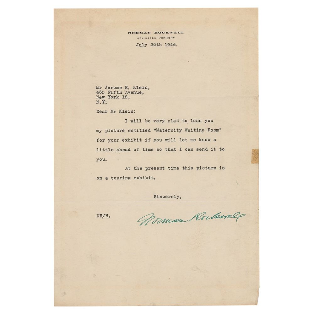 TLS, one page, 7.25 x 10.5, personal letterhead, July 20, 1946. Letter to Jerome E. Klein, in full: “I will be very glad to loan you my picture entitled ‘Maternity Waiting Room’ for your exhibit if you will let me know a little ahead of time so that I can send it to you. At the present time this picture is on a touring exhibit.” In fine condition, with a small tape stain to the right edge.