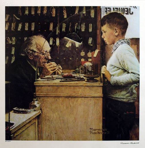 Norman Rockwell "Watchmaker of Switzerland" Facsimile Signed, Limited Edition Numbered Lithograph Dimensions: 24 x 25.5 inches (Note: edition number received may differ from photo)
