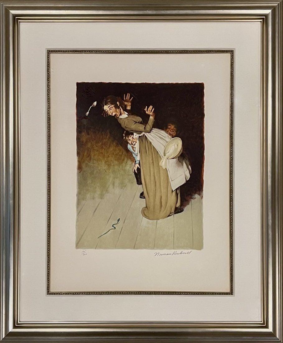 Norman Rockwell (1894-1978) Hand signed and numbered lithograph. "There Warn't No Harm/ Aunt Sally Frightened by a Snake." Year: 1972, suite: Story illustration for Huckleberry Finn, 1884. Hand signed in pencil bottom right margin, numbered 195/200 bottom left. Sheet 24 x 20 in, framed 35.5 x 30 inches. In excellent condition.