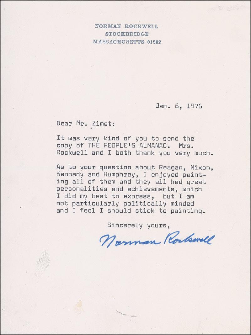 TLS, one page, 5.75 x 7.75, personal letterhead, January 6, 1976. In part: “As to your question about Reagan, Nixon, Kennedy and Humphrey, I enjoyed painting all of them and they all had great personalities and achievements, which I did my best to express, but I am not particularly politically minded and I feel I should stick to painting.” Intersecting folds with a central horizontal and vertical fold passing through his first name, and a couple spots of soiling and staining, otherwise fine condition.