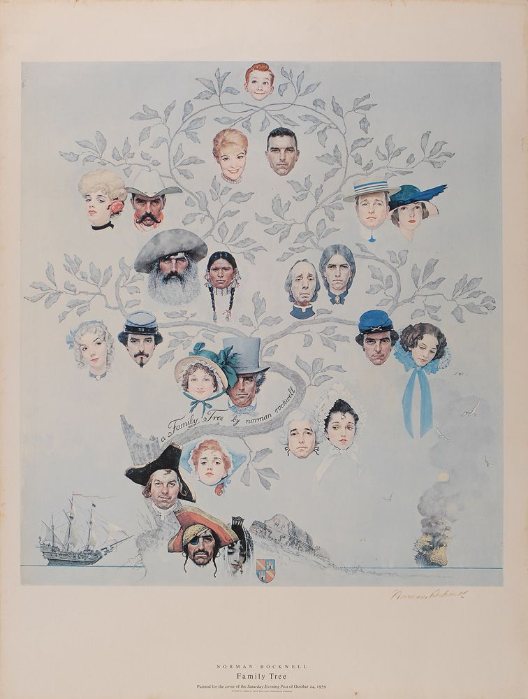 Color 18.75 x 25 print entitled ‘Family Tree,’ signed in black ink. In very good condition, with Rockwell’s signature faded, but still legible, toning to edges, and some slight rippling to top border.