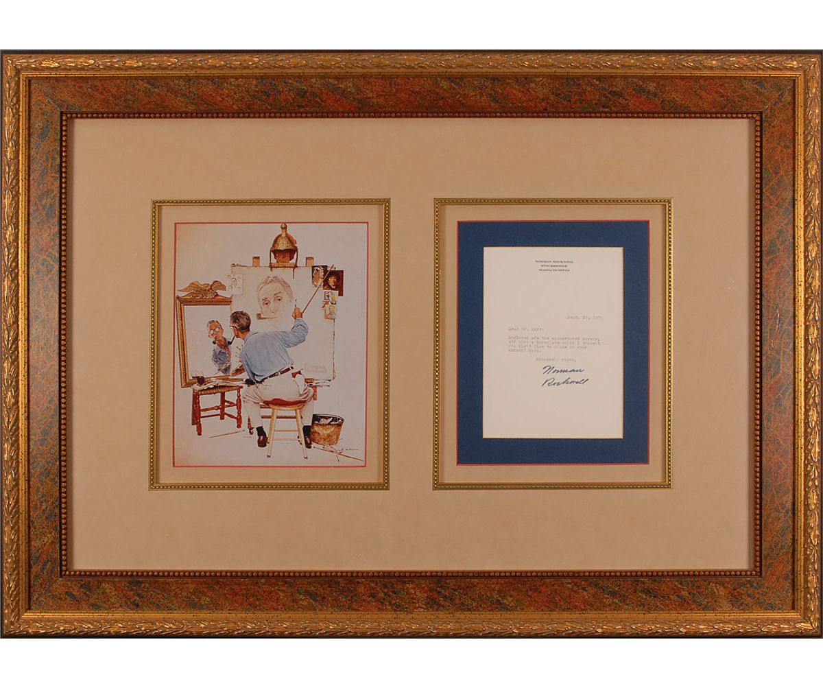 TLS, one page, 5.25 x 7.5, personal letterhead, September 27, 1971. Letter to an admirer. In full: “Enclosed are the autographed covers, and also a bookplate which I thought you might like to place in your Abram’s book.” Double-suede-matted and framed with a color photo of one of Rockwell’s works to an overall size of 32.5 x 23. In fine condition. Oversized.